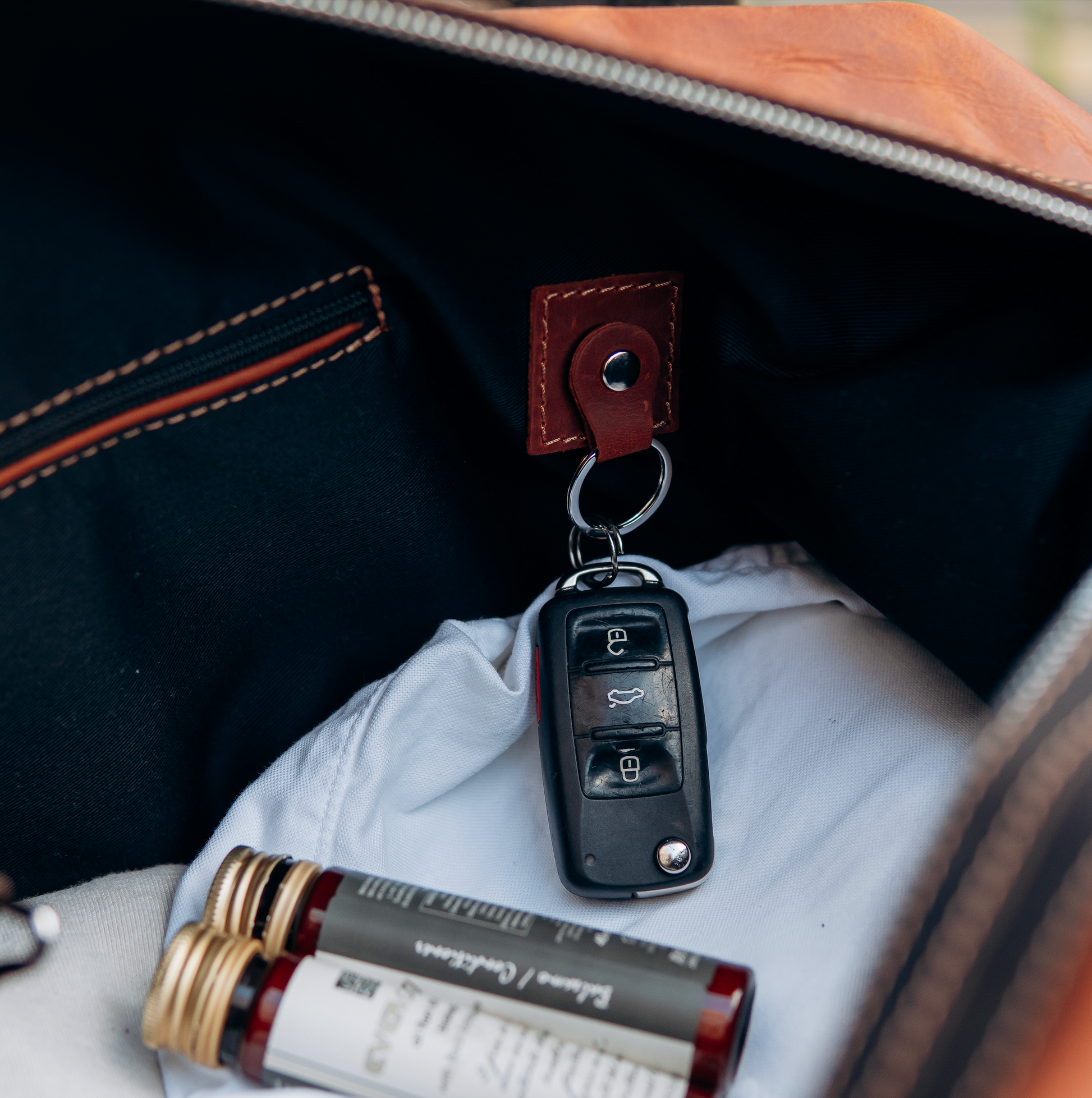 🟤 Inside zip pocket for small essentials